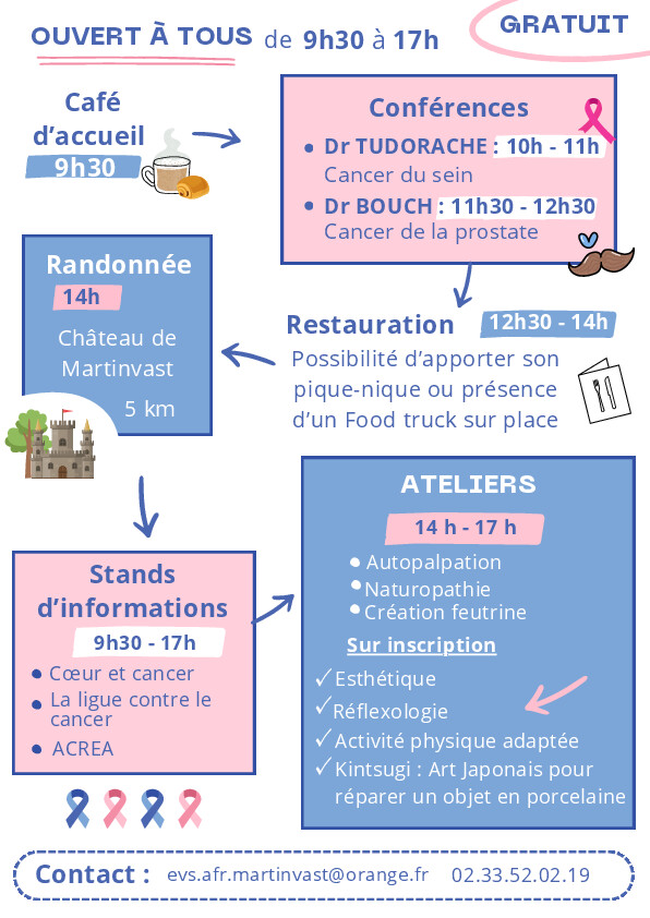 L'association des Familles Rurales de Martinvast, le CLIC Ouest Cotentin et le Pôle de santé Douve et Divette organisent une journée bien-être prévention des cancers à la salle Saint-Sébastien de