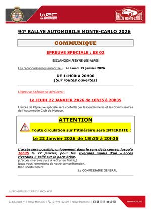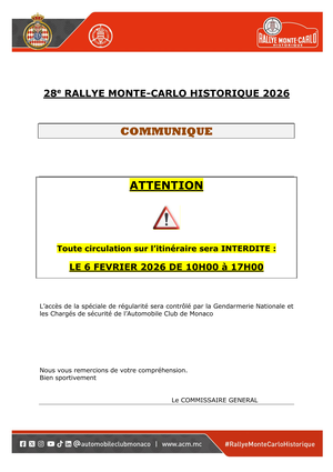 Le 28ᵉ Rallye Monte-Carlo Historique, dont les épreuves de régularité se déroulent sur routes fermées traversera notre commune le vendredi 6 février 2026.