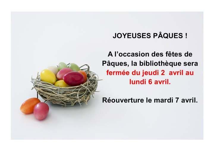 À l’occasion des fêtes de Pâques, votre bibliothèque sera exceptionnellement fermée :