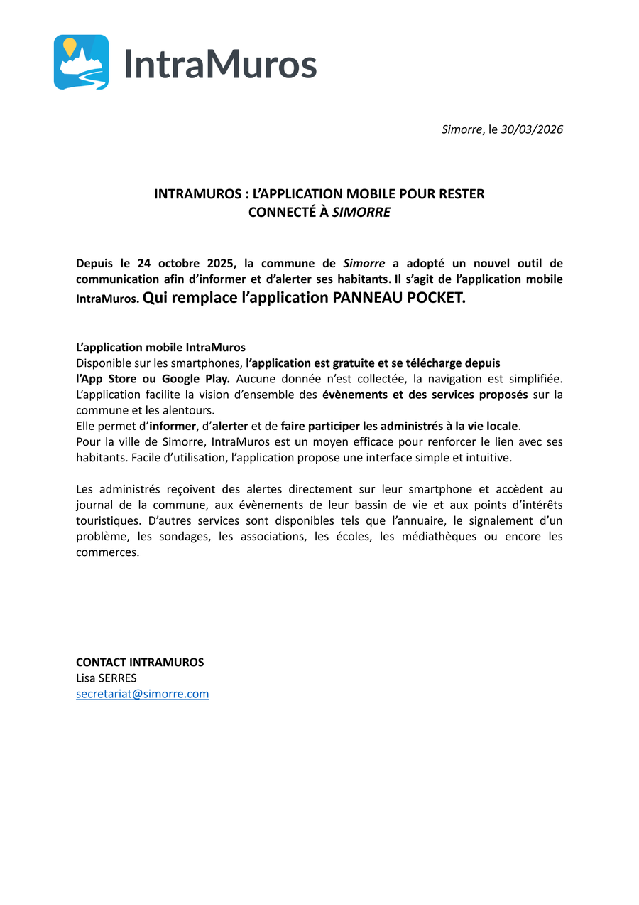 La commune est heureuse de mettre à disposition de ses habitants l’application PanneauPocket. Par cet outil très simple, elle souhaite tenir informés en temps réel les citoyens de son actualité au quotidien, et les alerter en cas de risques majeurs. Cette solution gratuite pour les habitants, sans récolte de données personnelles et sans publicité, permet d’établir un véritable lien privilégié entre le maire et ses citoyens.