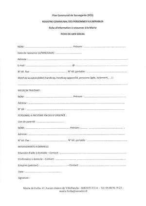 Les informations recueillies dans le présent document seront traitées conformément à la loi "Informatique et Libertés " du 6 janvier 1978. Ces fichiers sont conçus pour être utilisés uniquement dans le cadre du déclenchement du Plan de Sauvegarde de la Commune de Fuilla. En retournant ce document, vous autorisez la détention de ces données par les services de la Mairie auprès de laquelle vous pouvez vous adresser pour faire valoir vos droits d'opposition, d'accès et de rectification. Ces données seront mises à jour périodiquement.
