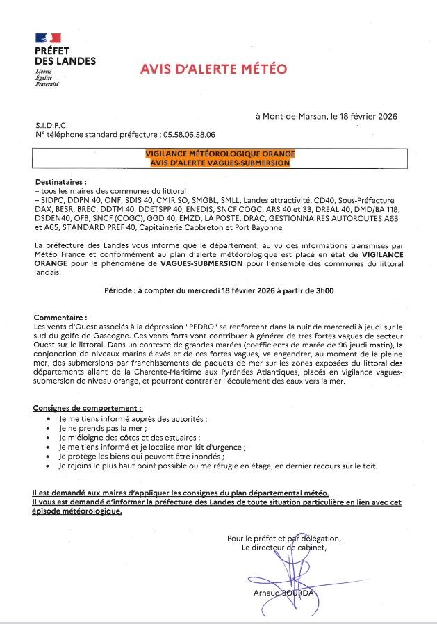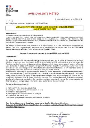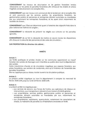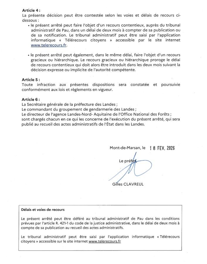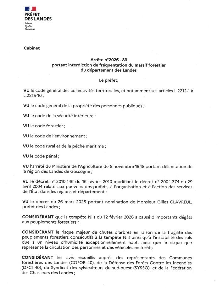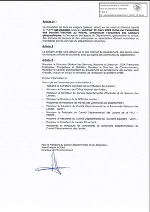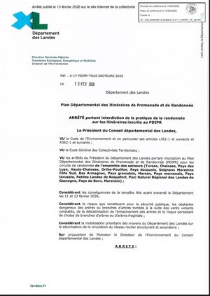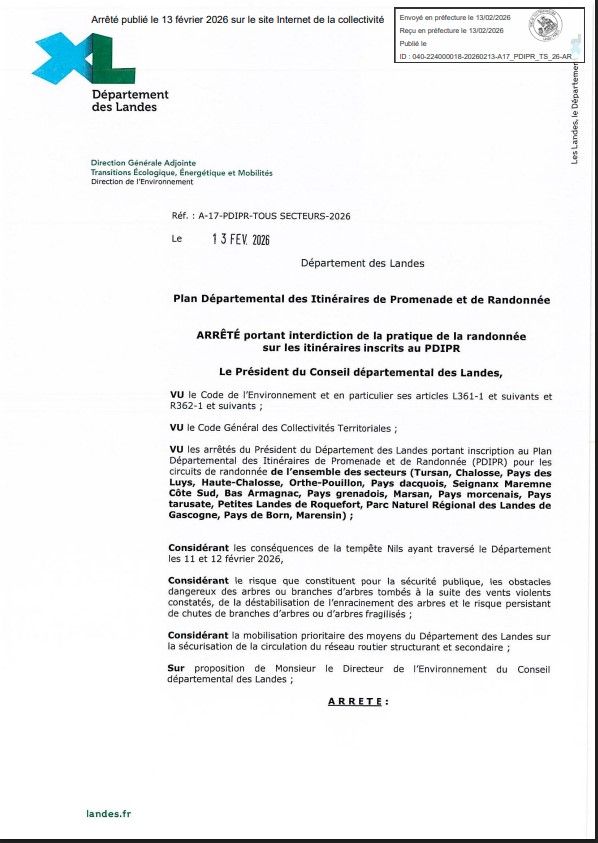 Arrêté du Conseil Départemental des Landes du 13 février 2026 interdisant la circulation des usagers (piétons, vélos) sur les voies et chemins inscrits au Plan Départemental des Itinéraires de Promenades et de Randonnées (PDIPR), considérant le risque pour le sécurité publique, les obstacles dangereux d’arbres ou de branches tombés au sol et le risque persistant de chutes d’arbres ou de branches.