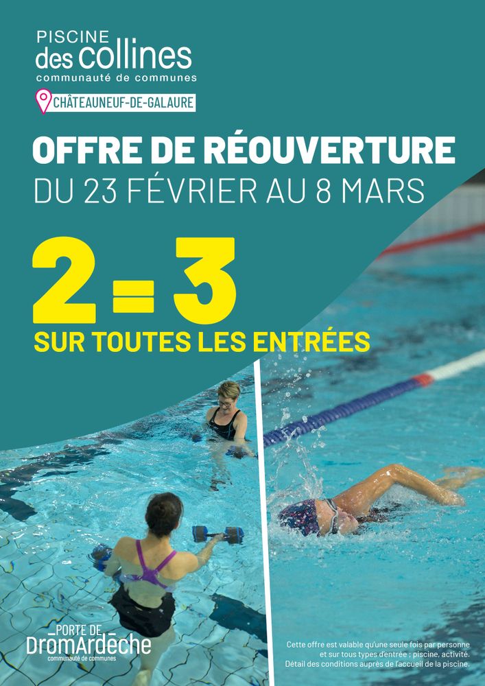 Et comme une bonne nouvelle n'arrive jamais seule, du 23 février au 8 mars, une offre promotionnelle permet l'achat de 3 entrées au prix de 2. Les modalités de l'offre sont disponibles auprès de l'accueil de la piscine.