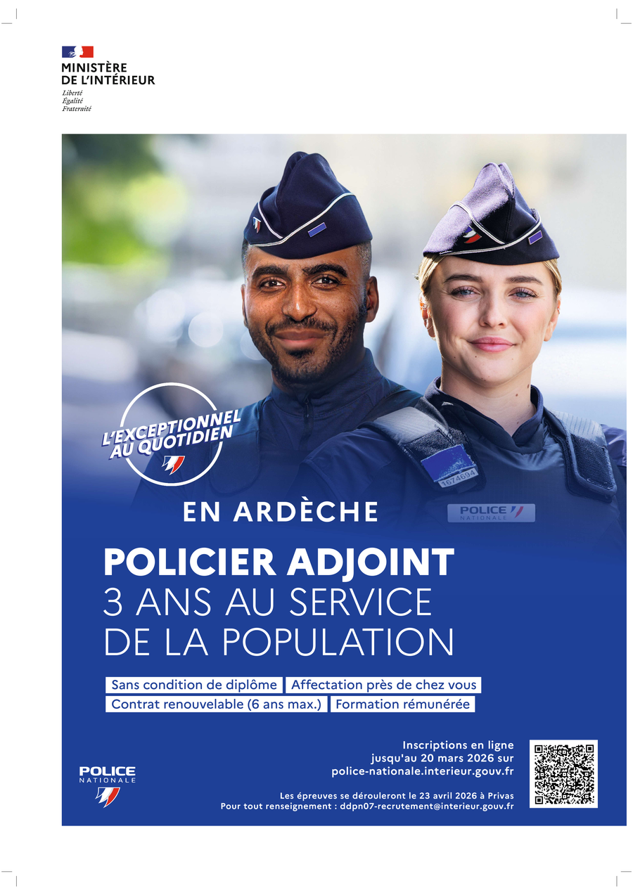 RECRUTEMENT POLICIERS ADJOINTS – INSCRIPTION JUSQU’AU 20 MARS 2026 @Police nationale de l’Ardèche