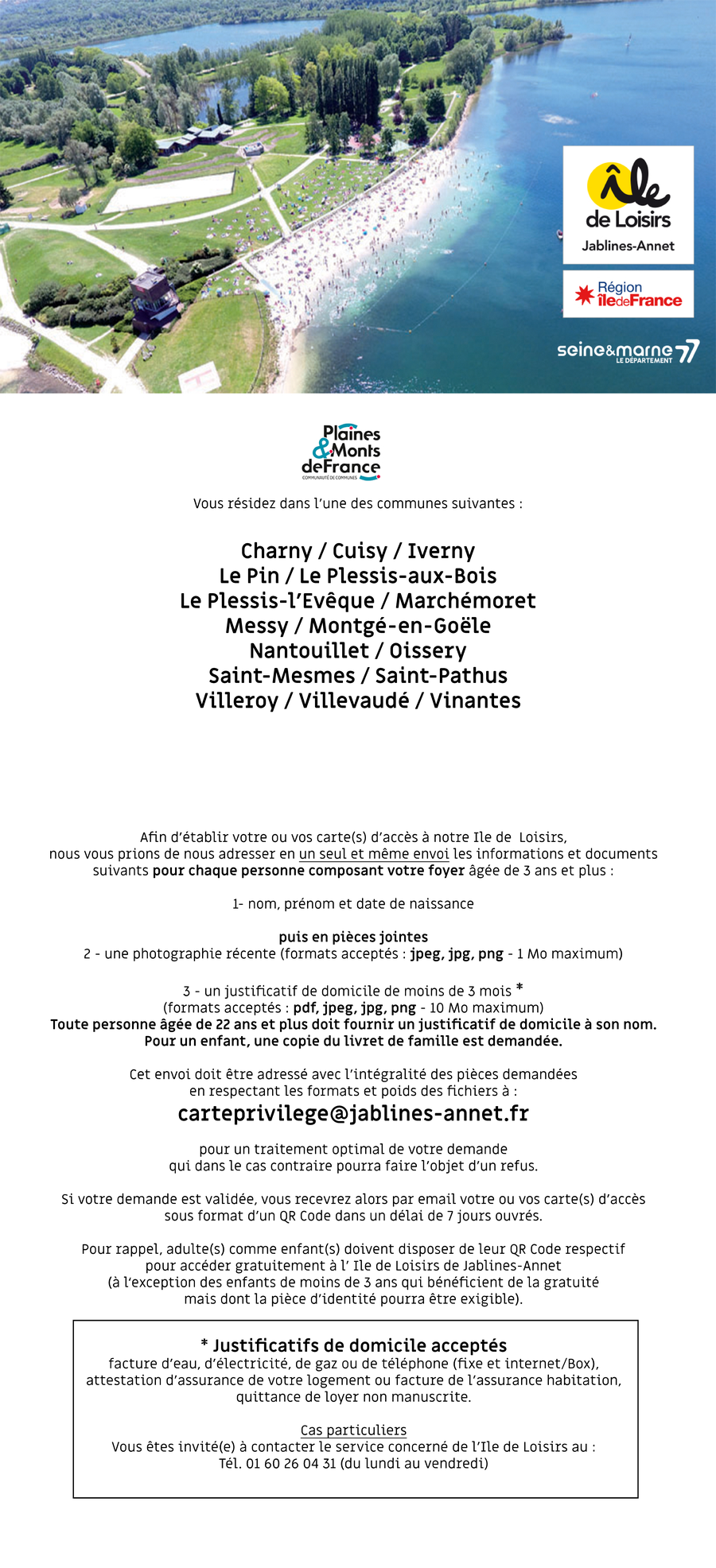 A partir de mai 2024, vous pouvez profiter gratuitement (pendant la période payante, c'est à dire de mai à septembre) de l'Ile de loisirs Jablines-Annet.