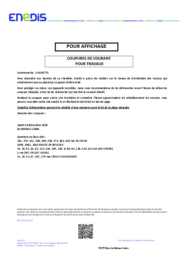Enedis vous informe d'une coupure de courant concernant la commune de CHARETTE en raison de travaux qui entraîneront une coupure d’électricité sur le territoire de la commune :