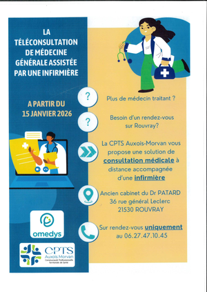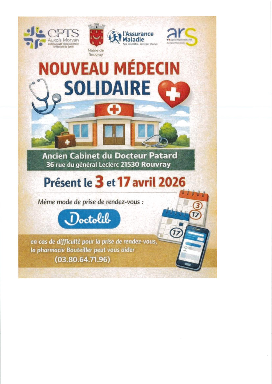 En ce début d’année 2026, nous souhaitons vous informer de la mise en œuvre de deux dispositifs de consultation médicale au cabinet médical de ROUVRAY (ancien cabinet du Dr PATARD), en lien avec la commune et les partenaires locaux.