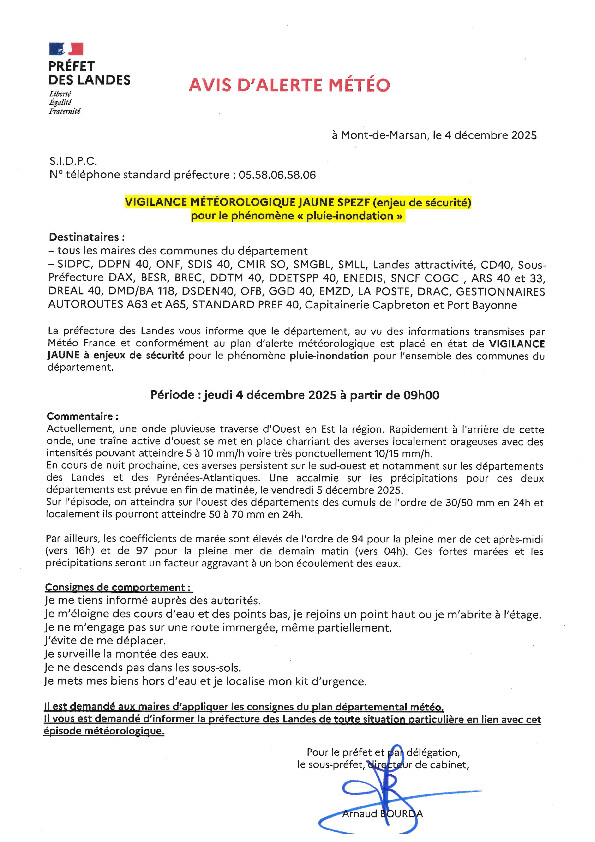 En raison de 2 arbres tombés sur la route au niveau du 1204 route du Luy de France,