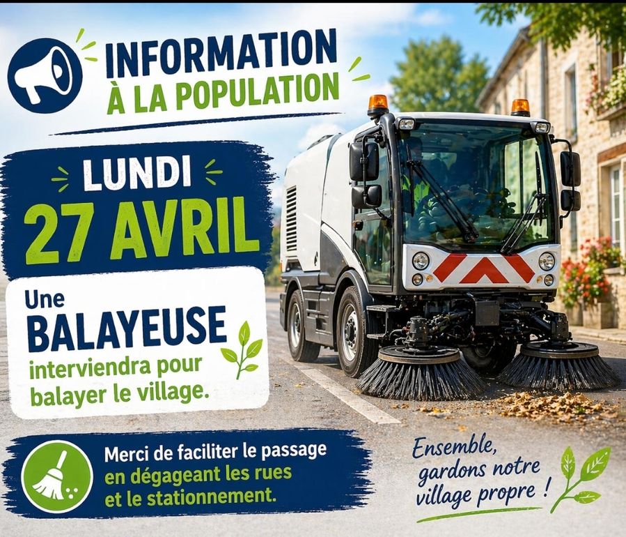Une balayeuse interviendra dans nos villages lundi 27 avril afin d’assurer le nettoyage des rues.