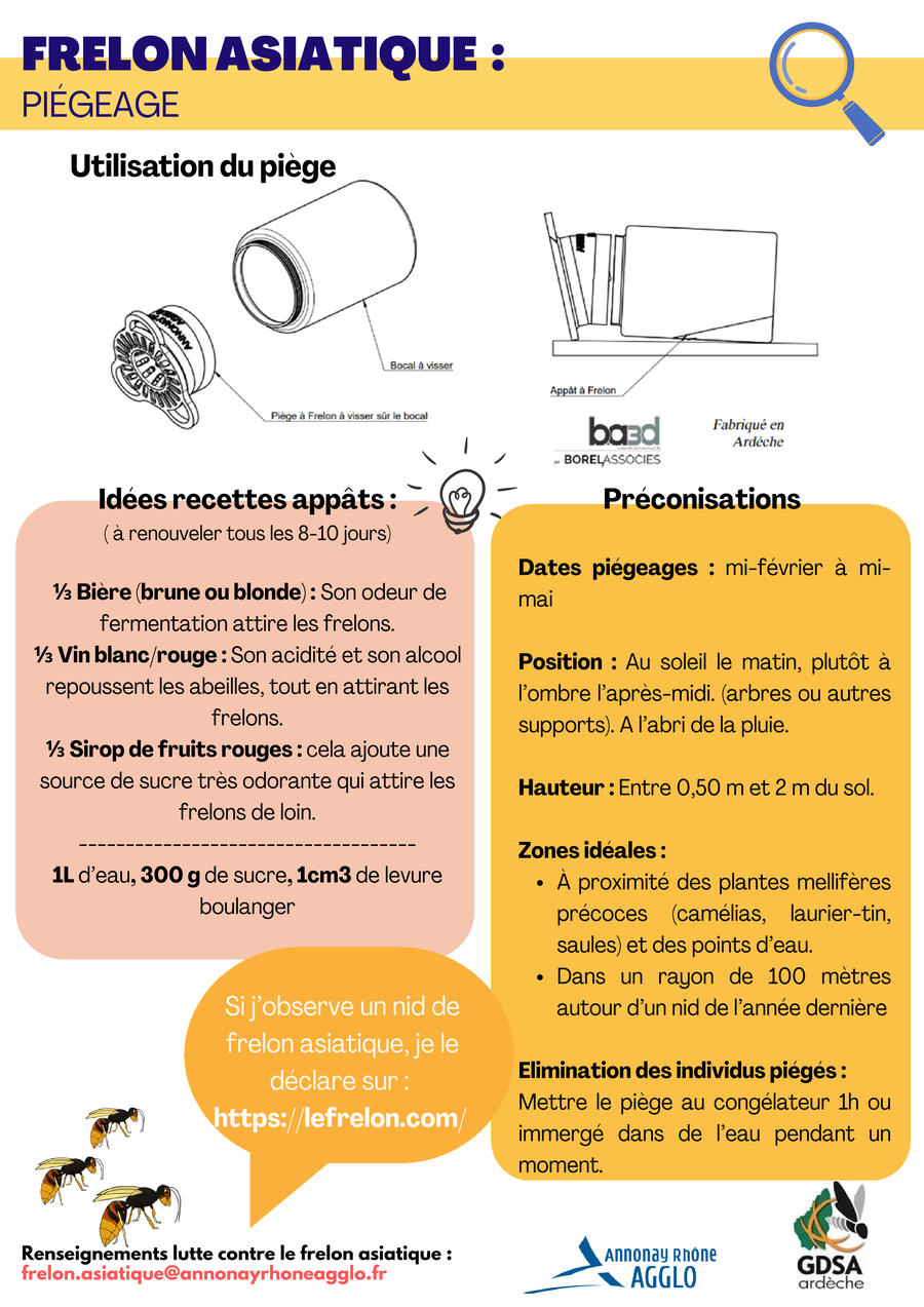 Aussi, si vous constatez la présence de frelon asiatique contactez la mairie qui centralise les demandes et qui vous aidera à l'installation de piéges.