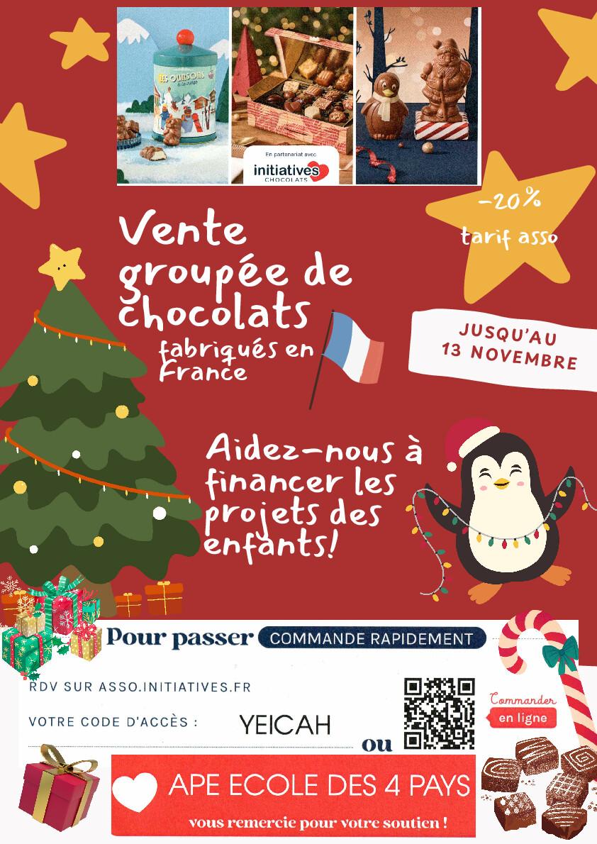 Pour préparer les fêtes de fin d’année, l’association de l’École des 4 Pays vous propose une belle initiative gourmande et solidaire : une vente de délicieux chocolats de Noël, fabriqués en France, à prix associatif (-20 % par rapport aux prix publics) !