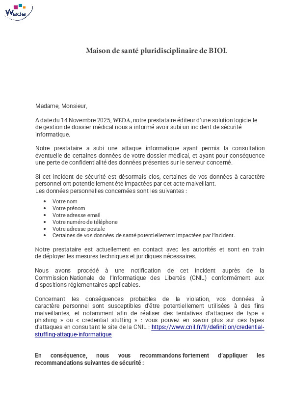 Le 14/11/2025, WEDA, le prestataire de gestion des dossiers médicaux de La Maison médicale de Biol a été victime d'une attaque informatique.