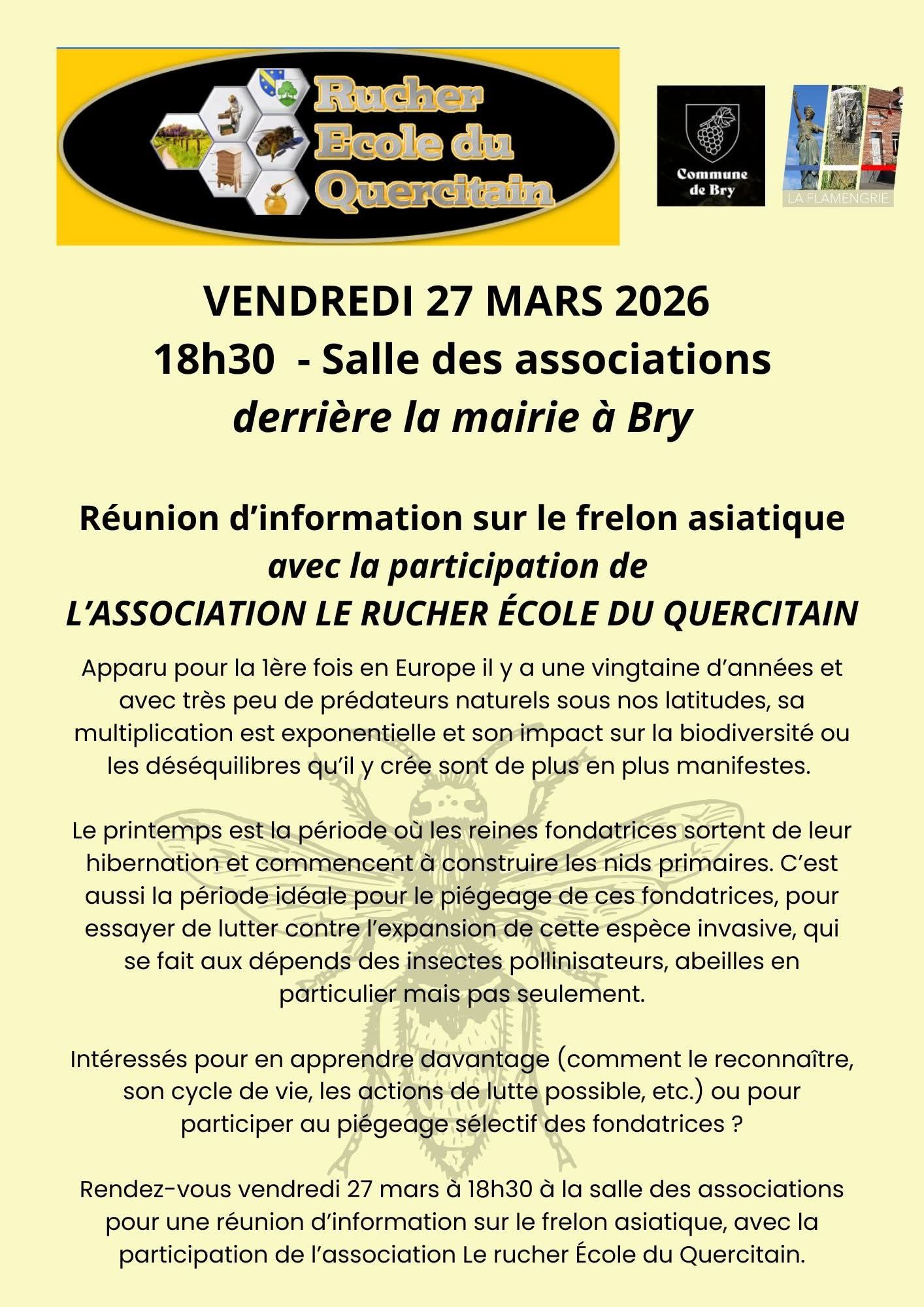 Ce vendredi 27 mars à 18h30, nous vous proposons une réunion d’information dédiée au frelon asiatique, en présence de l’association Le Rucher École du Quercitain dans la commune voisine de Bry