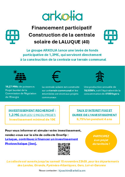 Il s’agit d’une nouvelle levée de fonds via financement participatif pour Arkolia, une collecte dédiée pour la construction de la centrale solaire au sol de LALUQUE (40) d’une puissance de 16,27 MW.