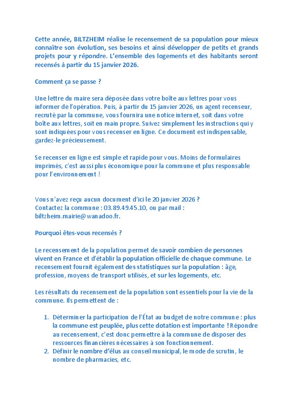Le recensement s'effectuera à partir du 15 janvier 2026. Veuillez prendre connaissance du courrier joint.