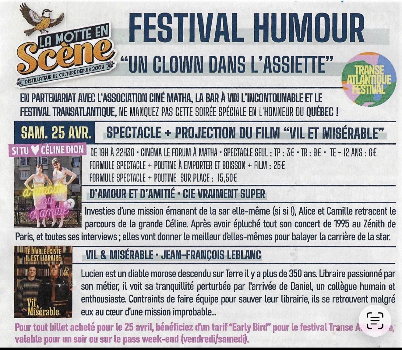 Tarifs : soirée complète 13€ / réduit 10€ /