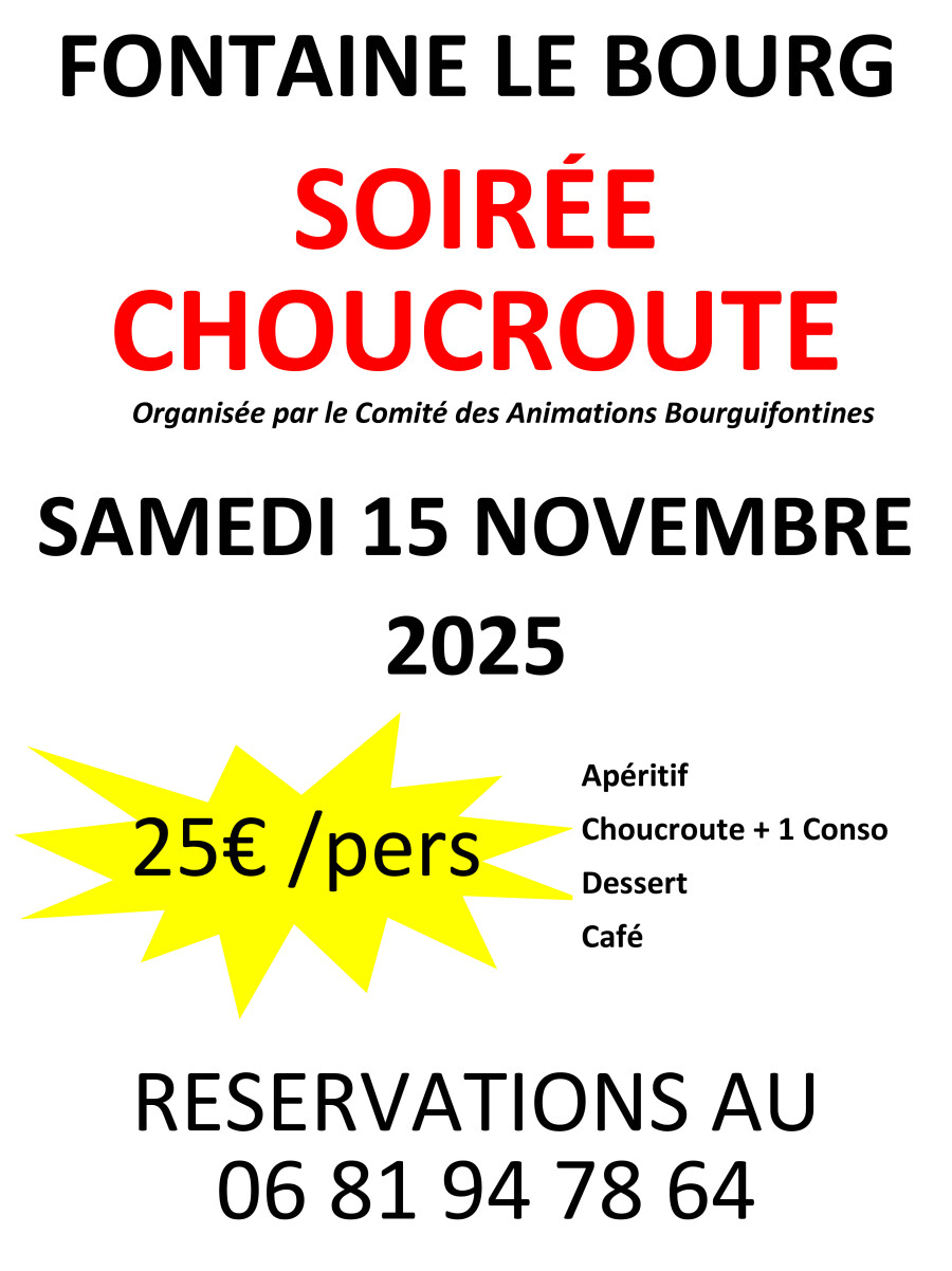 Le Comité des Animations Bourguifontaines organise une délicieuse soirée Choucroute le samedi 15 novembre 2025 à la salle des Tourelles.