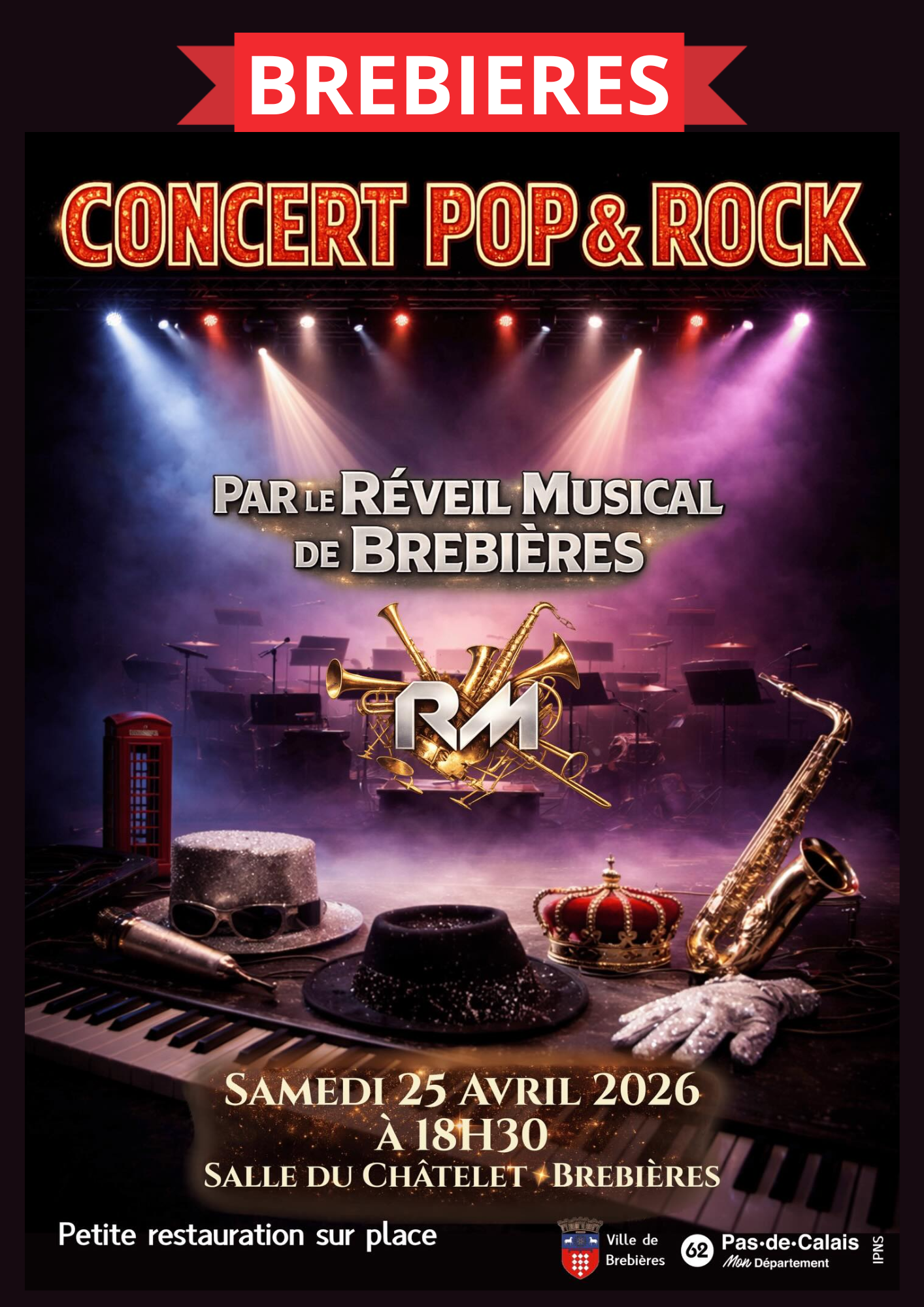Le Réveil Musical de Brebières vous invite à une soirée exceptionnelle placée sous le signe de la pop et du rock ! Rendez-vous le samedi 25 avril 2026 à 18h30 à la salle du Châtelet pour profiter d’un concert dynamique, festif et accessible à tous. Dans une ambiance conviviale, laissez-vous emporter par les plus grands classiques revisités par les musiciens.