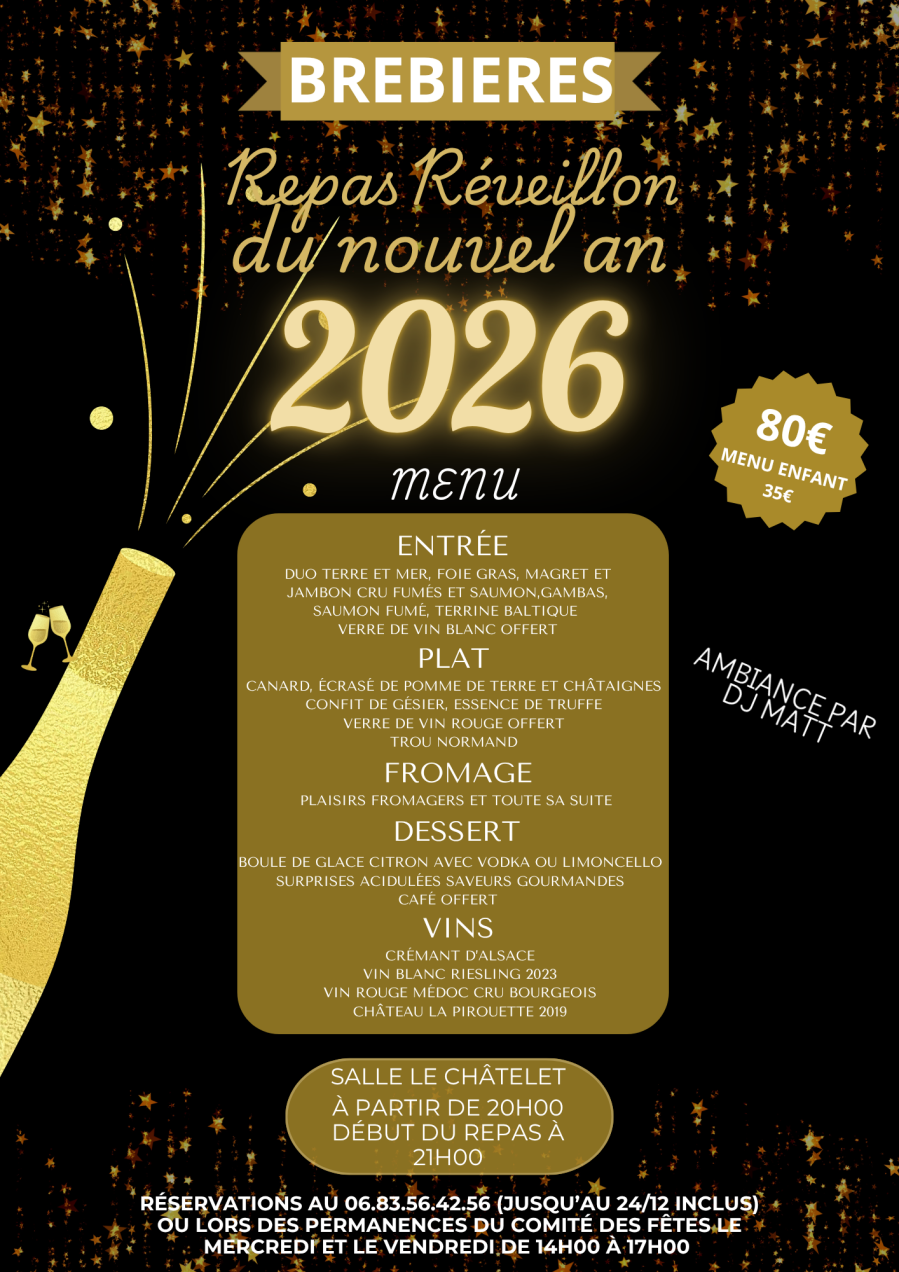 Après son succès l’année dernière, le Comité des Fêtes vous invite à célébrer la nouvelle année lors d’un dîner de la Saint-Sylvestre animé par DJ MATT dans la salle Le Châtelet ! Venez profiter d'une soirée festive, dansante et conviviale au prix de 80€ par personne (menu enfant à 35 €).