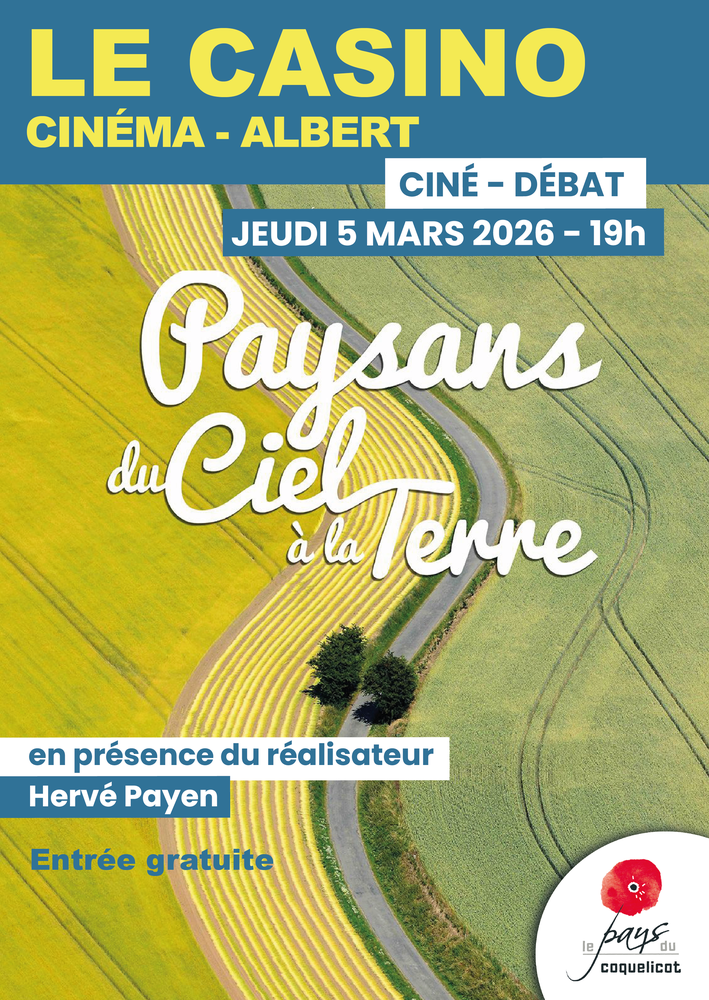 Face aux difficultés du monde agricole et aux territoires inondés, la Communauté de communes du Pays du Coquelicot organise un ciné-débat autour des thématiques du ruissellement, des coulées de boue et le lien avec l'agriculture et le travail du sol. La présence d'Hervé Payen, réalisateur du film "Paysans du ciel à la terre" sera l'occasion d'échanger sur ces phénomènes de plus en plus récurrents et violents, mais aussi sur les solutions collectives à apporter.