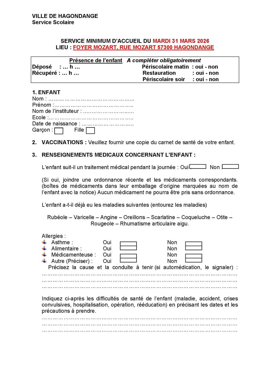 Les familles, souhaitant bénéficier du service minimum d’accueil, devront remplir impérativement un document administratif (disponible sur site de la ville, Facebook de la ville, Panneau Pocket et Portail famille). Ce document devra nous être retourné pour le 30/03 avant 16h00 délai de rigueur (pole.education@ville-hagondange.fr). Pour plus d’informations joindre le Service Pôle Education au 03/87/71/50/10.
