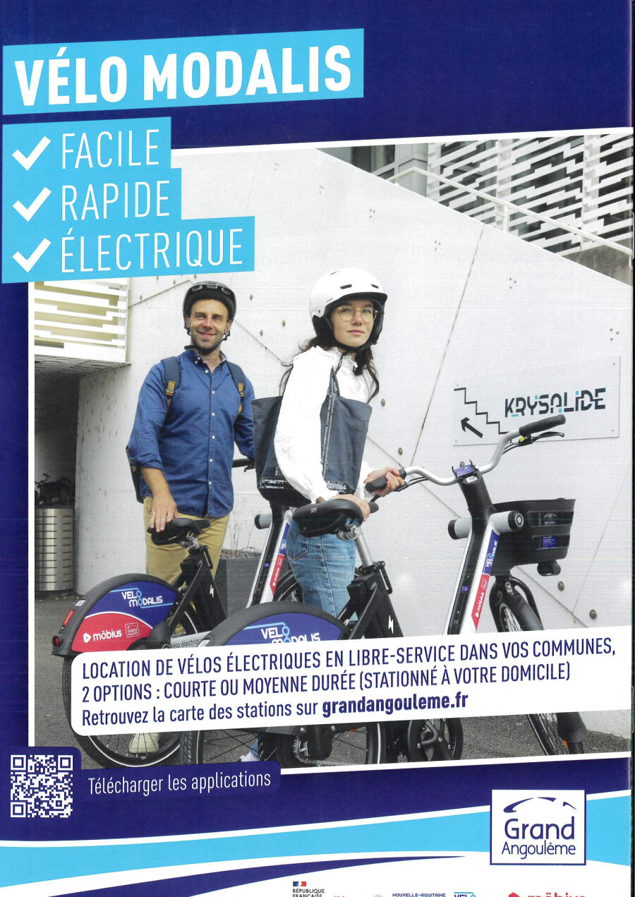 Des vélos électriques sont proposés à la location sur notre commune. Ce service de location libre-service proposé sur GrandAngoulême est aussi disponible sur les agglomérations de Cognac, Saintes et Royan.