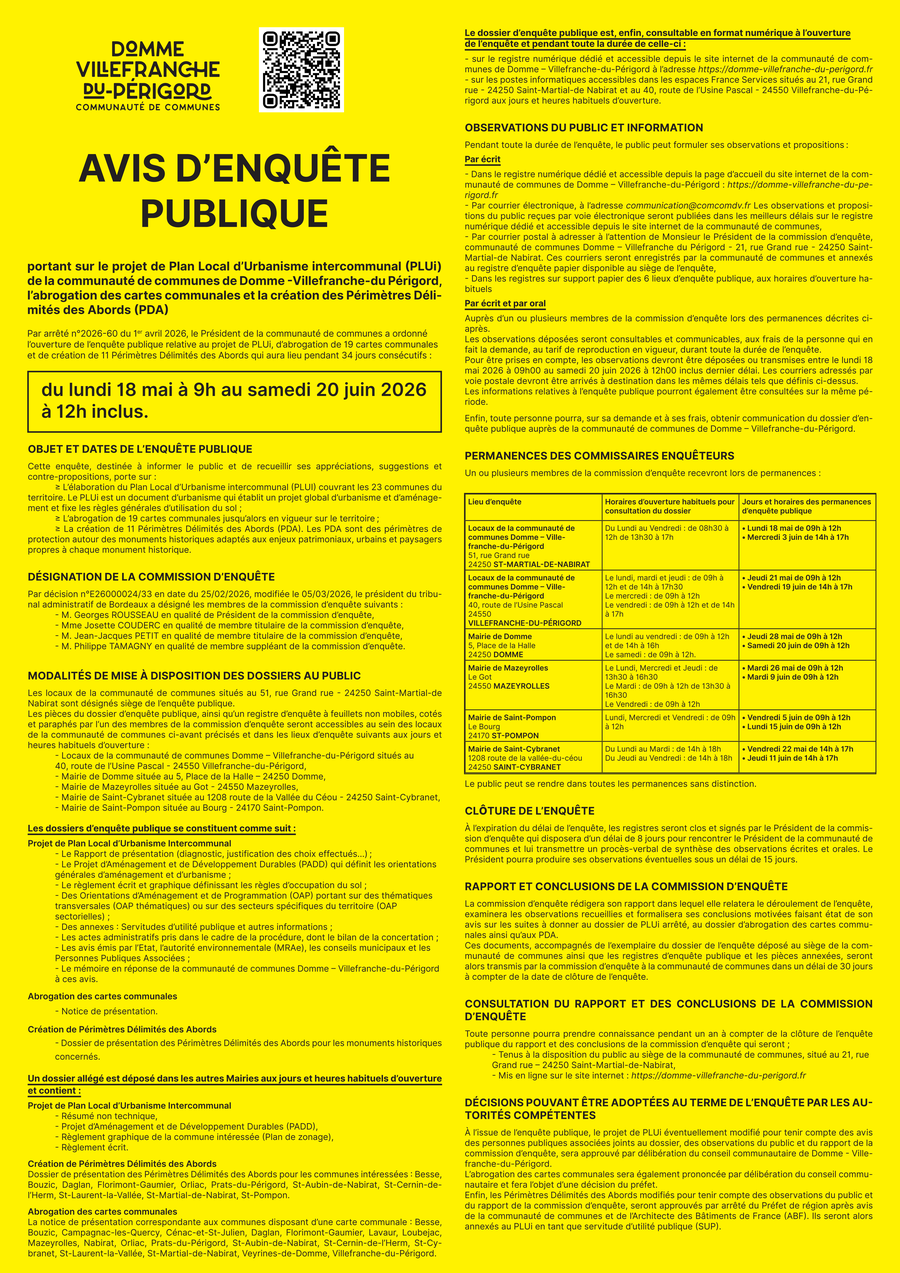 Cette enquête est destinée à informer le public et à recueillir ses appréciations, suggestions et contre-propositions sur l'élaboration du Plan Local d'Urbanisme Intercommunal (PLUI)