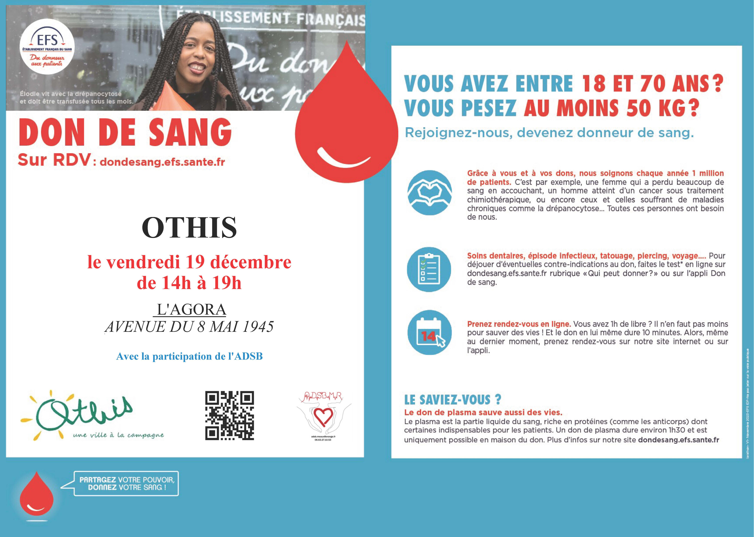 Les bénévoles de l’ Adsb Meaux et sa région Bénévole accueilleront les volontaires au don de sang pendant la collecte organisée par l' Etablissement Français du Sang (EFS) avec le concours de la Ville, vendredi 19 décembre de 14h à 19h à l'Agora, Avenue du 8 mai 1945.