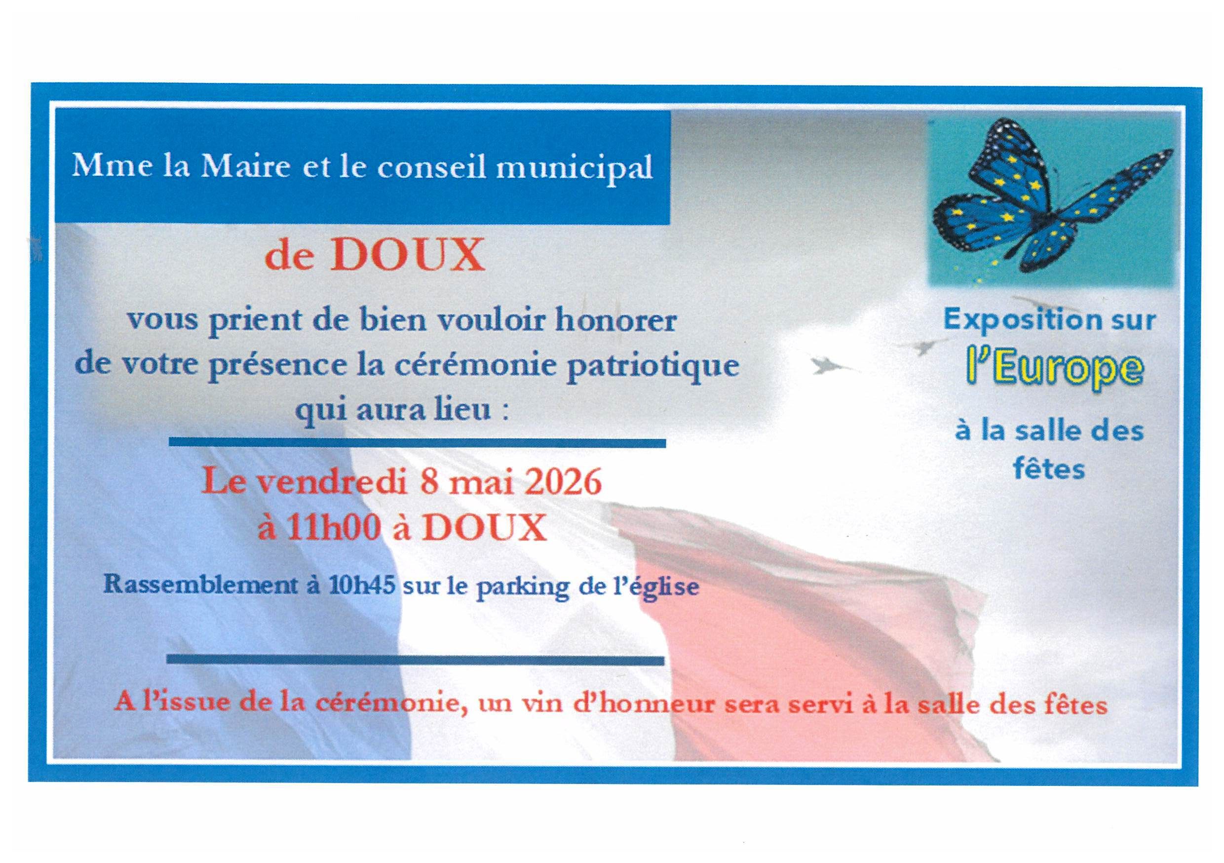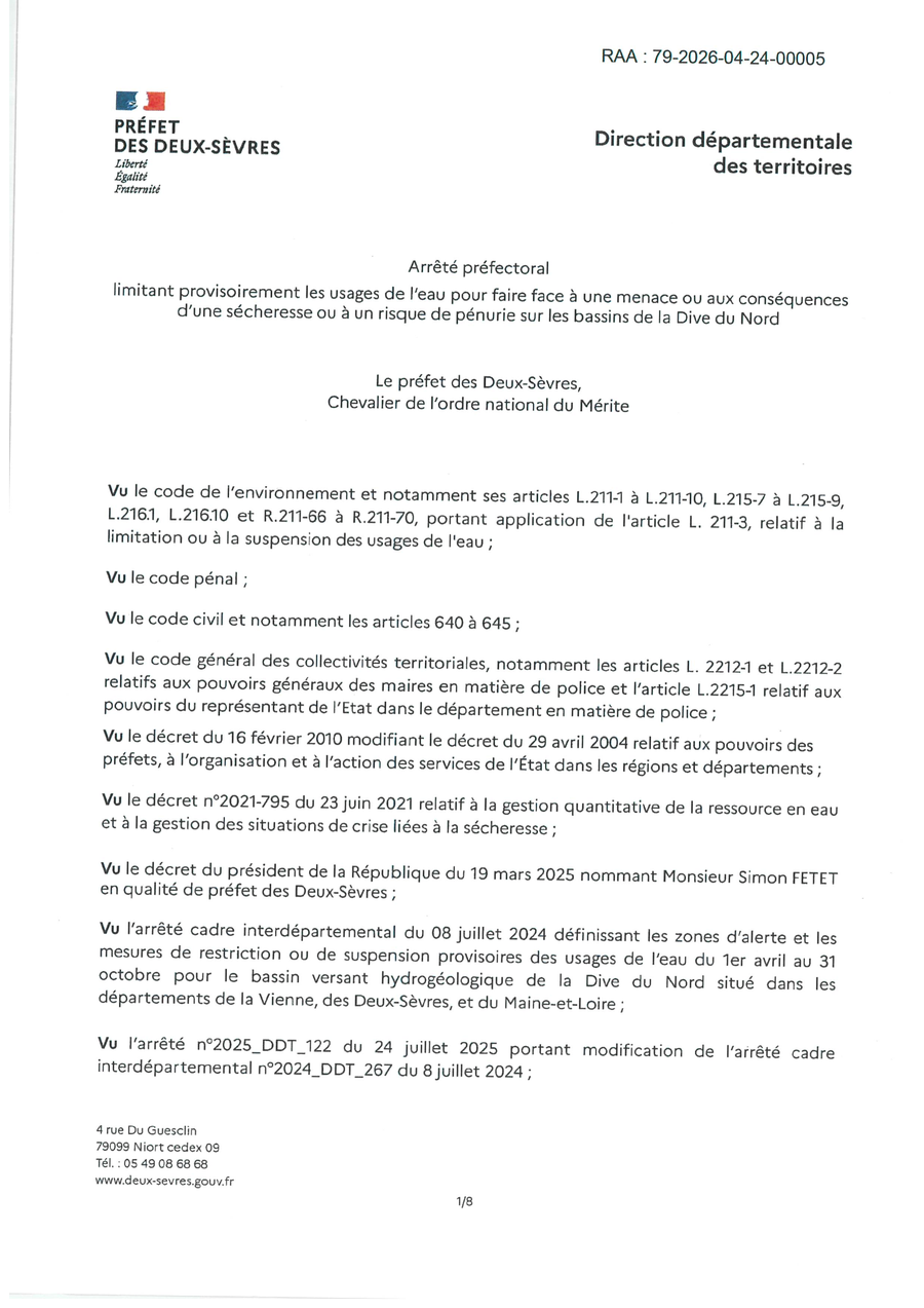 Par arrêté préfectoral du 24 avril 2026, la commune de DOUX est placée en VIGILANCE à compter du 27 avril 2026 :