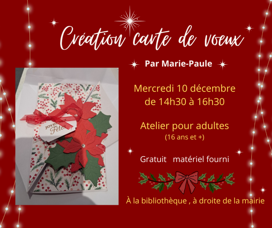 Création de carte de noël à la bibliothèque avec Marie Paule TREMBLAY. Atelier GRATUIT, sur inscription, reservé aux adultes (+16 ans).