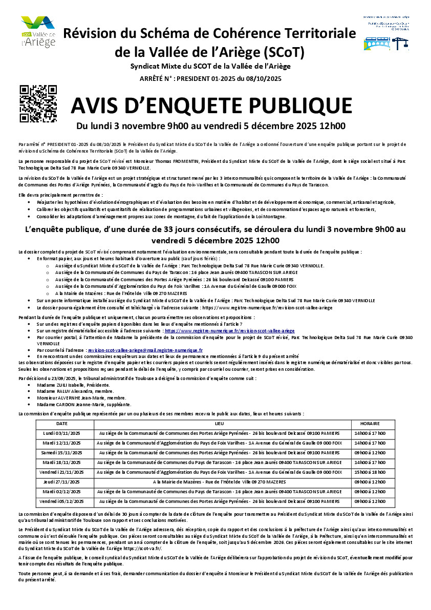 · Par courrier postal, à l’attention de Madame la présidente de la commission d’enquête pour le projet de SCoT révisé, Parc Technologique Delta Sud 78 Rue Marie Curie 09340
