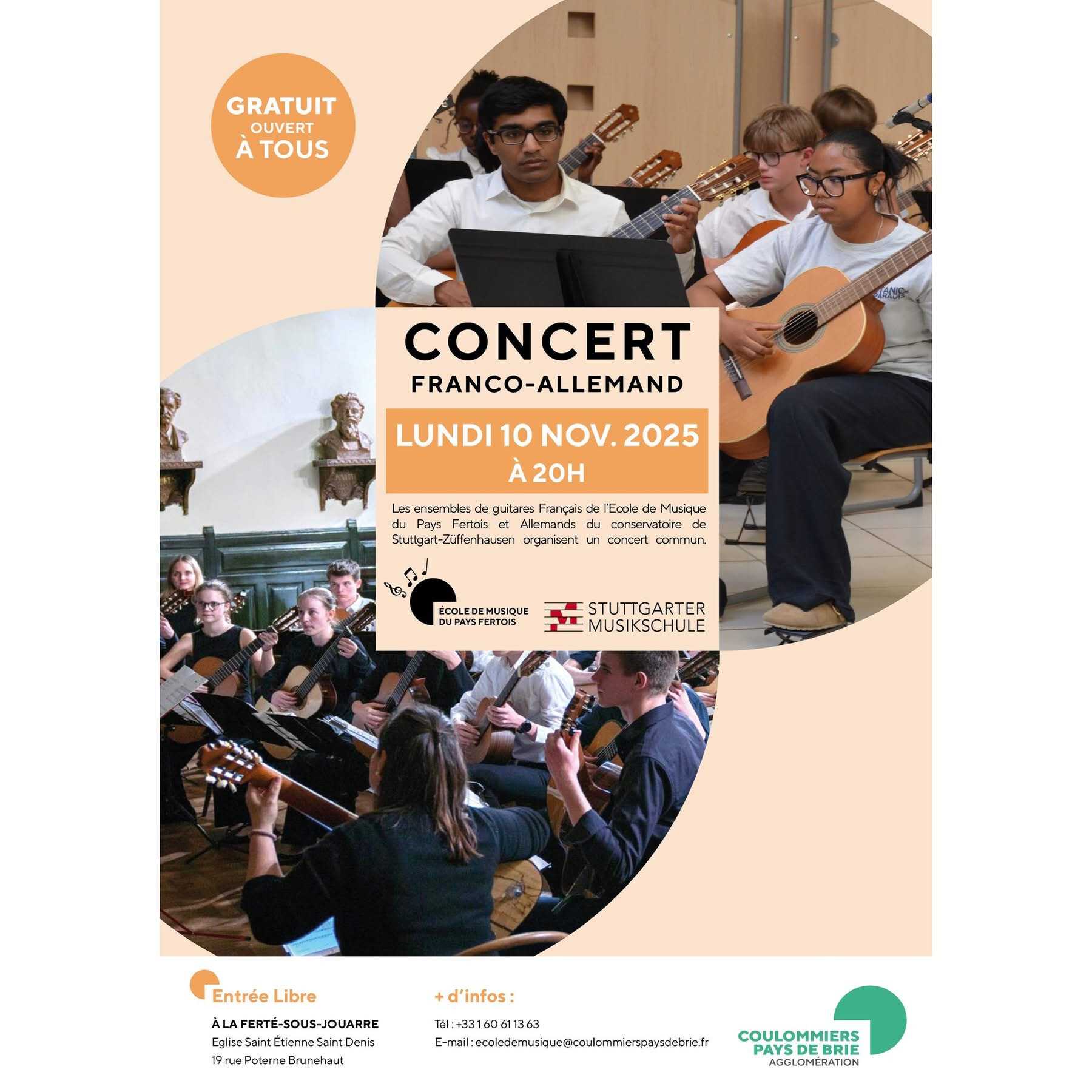 L’École de Musique du Pays Fertois et le conservatoire de Stuttgart-Züffenhausen ont le plaisir de vous proposer un concert commun exceptionnel. Les ensembles de guitares français et allemands joueront chacun leur propre répertoire et le concert se terminera par des pièces jouées en commun. Ce concert s’inscrit dans la dynamique culturelle musicale impulsée par la communauté d’agglomération Coulommiers Pays de Brie en faveur des échanges culturels pour les jeunes du territoire.