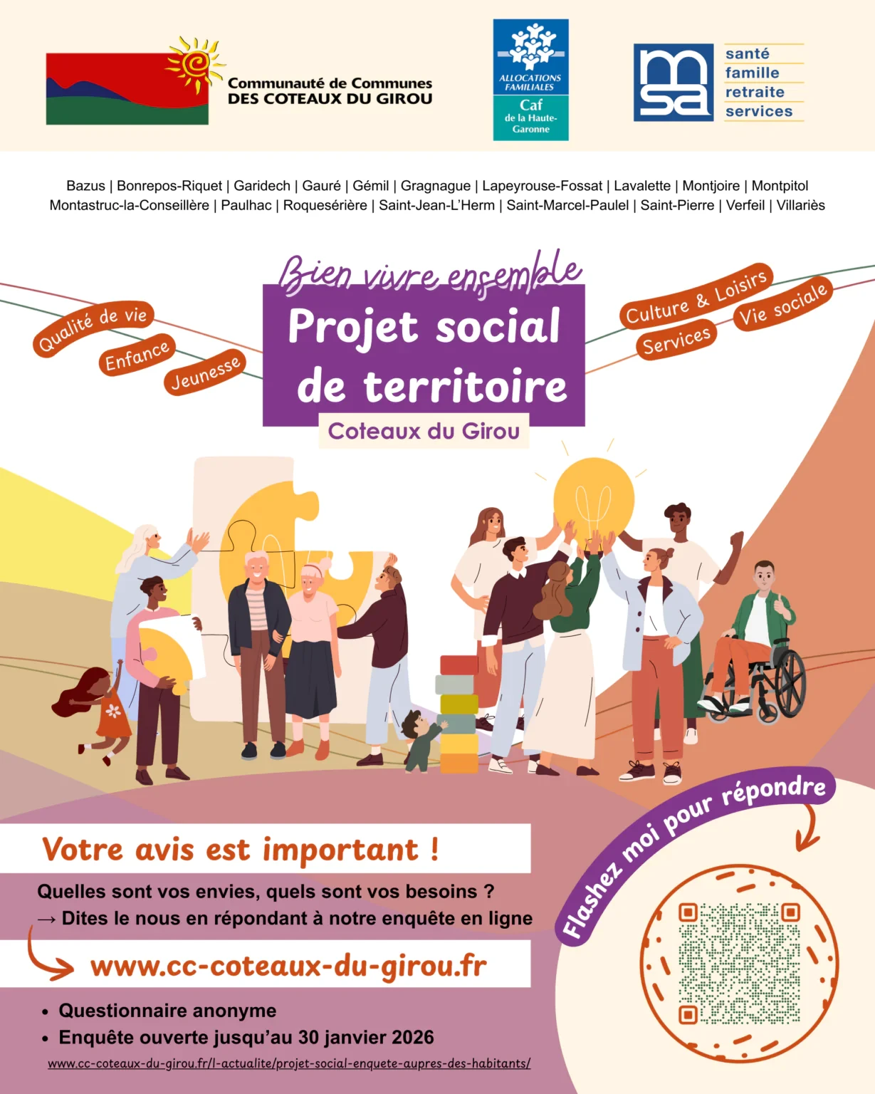La Communauté de Communes des Coteaux du Girou lance une grande enquête auprès des habitants dans le cadre du renouvellement de son 𝐏𝐫𝐨𝐣𝐞𝐭 𝐒𝐨𝐜𝐢𝐚𝐥 𝐝𝐞 𝐓𝐞𝐫𝐫𝐢𝐭𝐨𝐢𝐫𝐞, en partenariat avec la CAF et la MSA de la Haute-Garonne.