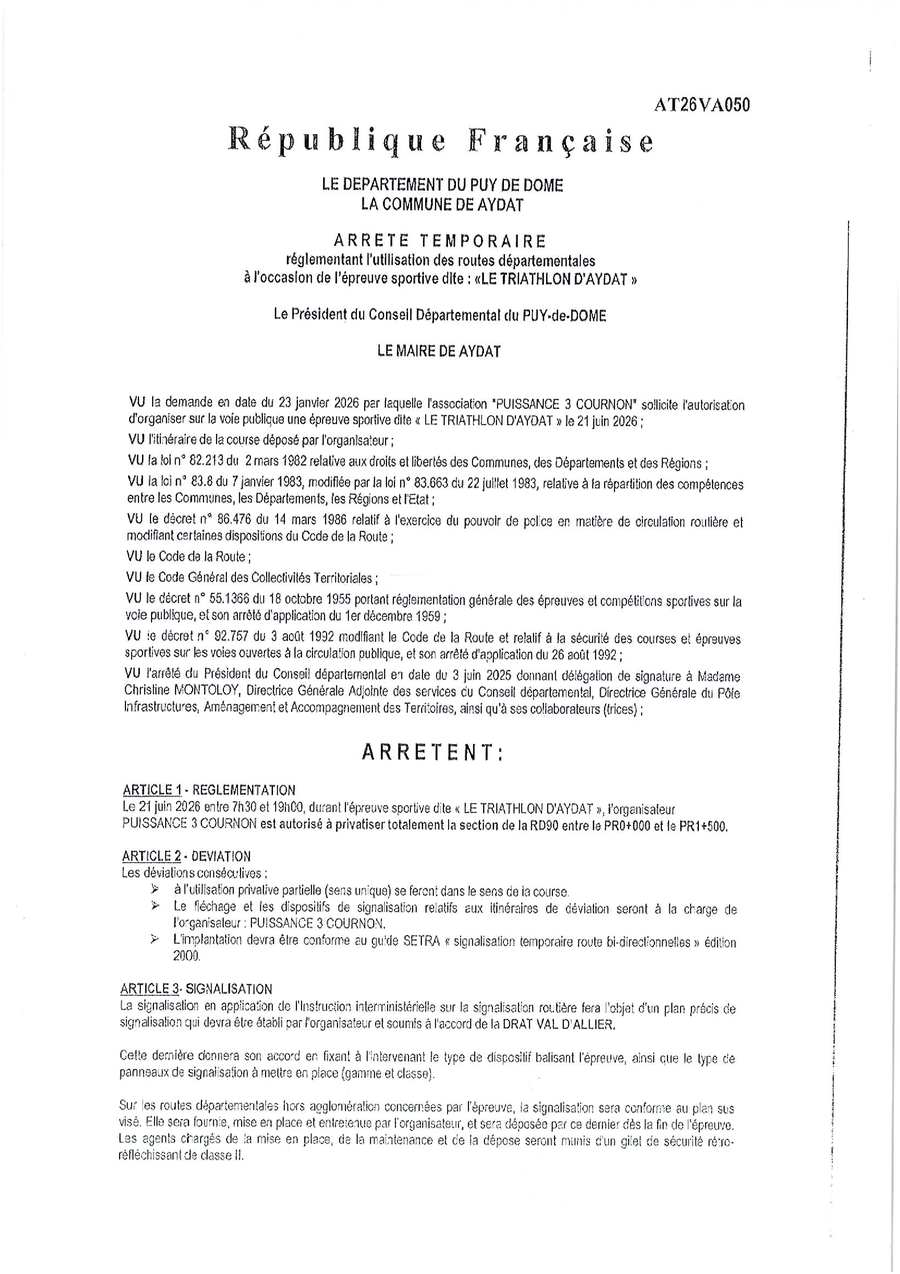 Le triathlon d'Aydat traversera la commune (route de Granchamp, rue Principale) le 21/06/26.