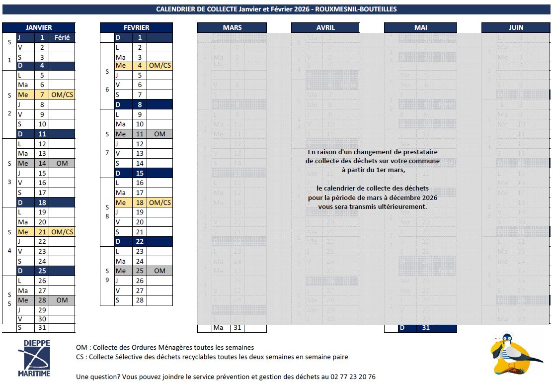 En raison d’un changement de prestataire de collecte à partir du 1er mars 2026, le calendrier de collecte des déchets pour la période de mars à décembre 2026 vous sera transmis ultérieurement.