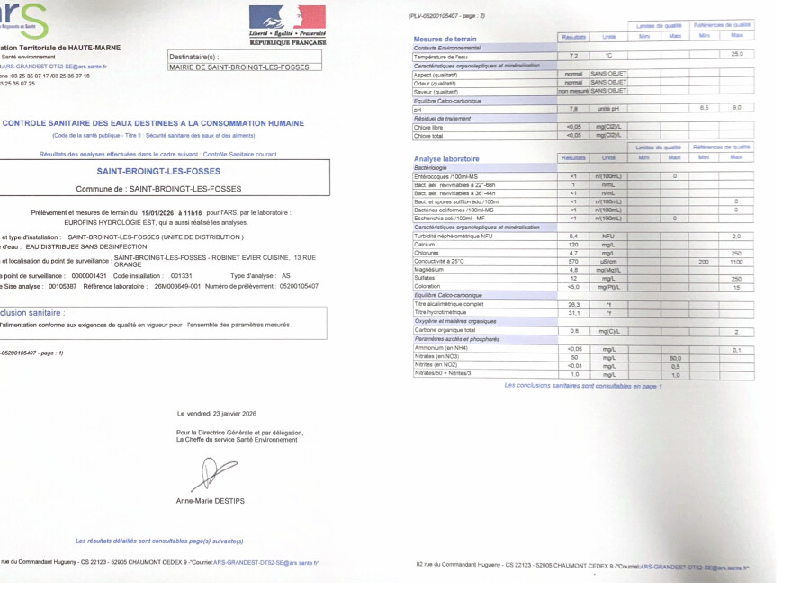 Faisant suite à l’analyse d’eau du 19 janvier 2026 : les résultats sont en conformité avec les règles en vigueur.