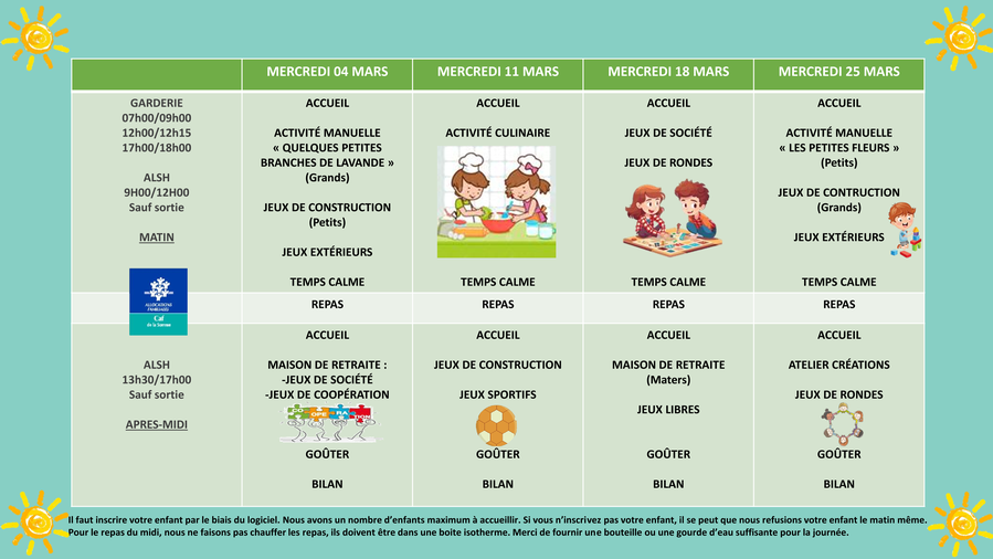 Pour les enfants scolarisés à l'école, les programmes seront remis à votre enfant ce jour.