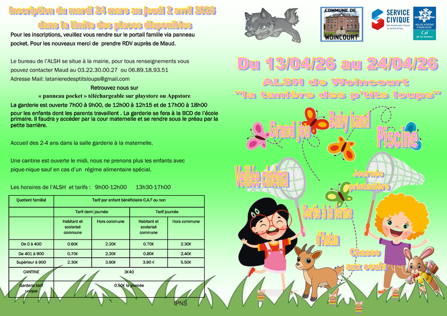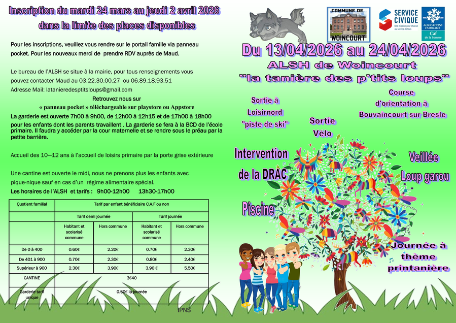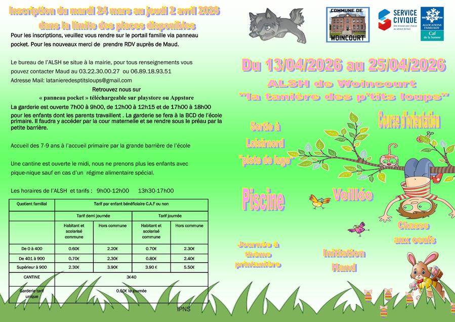 Les inscriptions pour les vacances d'avril commencent ce mardi 24 mars à partir de 10h00 et jusqu'au jeudi 2 avril 18h00 .
