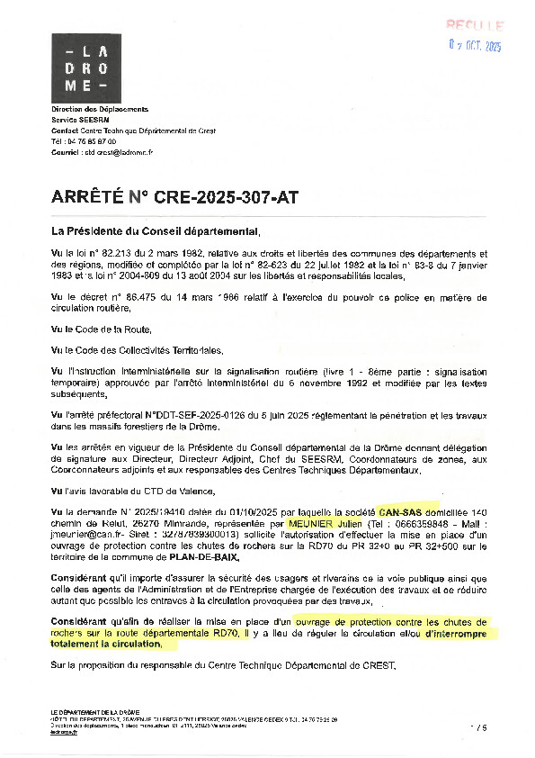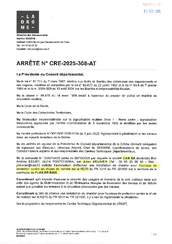ATTENTION FERMETURE TOTALE à la circulation RD70 ACCES BRUDOUX DU 20 AU 31/10/2025