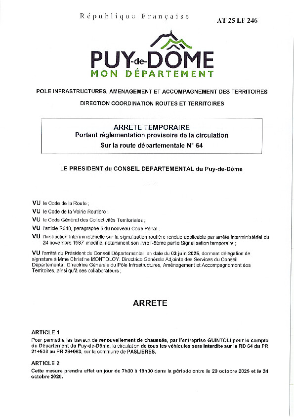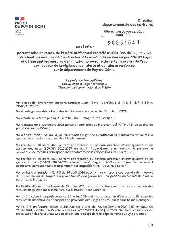 L'arrêté préfectoral n° 20251728 en date du 09 octobre 2025 instaurant les mesures de restriction des usages de l'eau dans le Puy-de-Dôme est applicable du 11 au 31 octobre 2025.