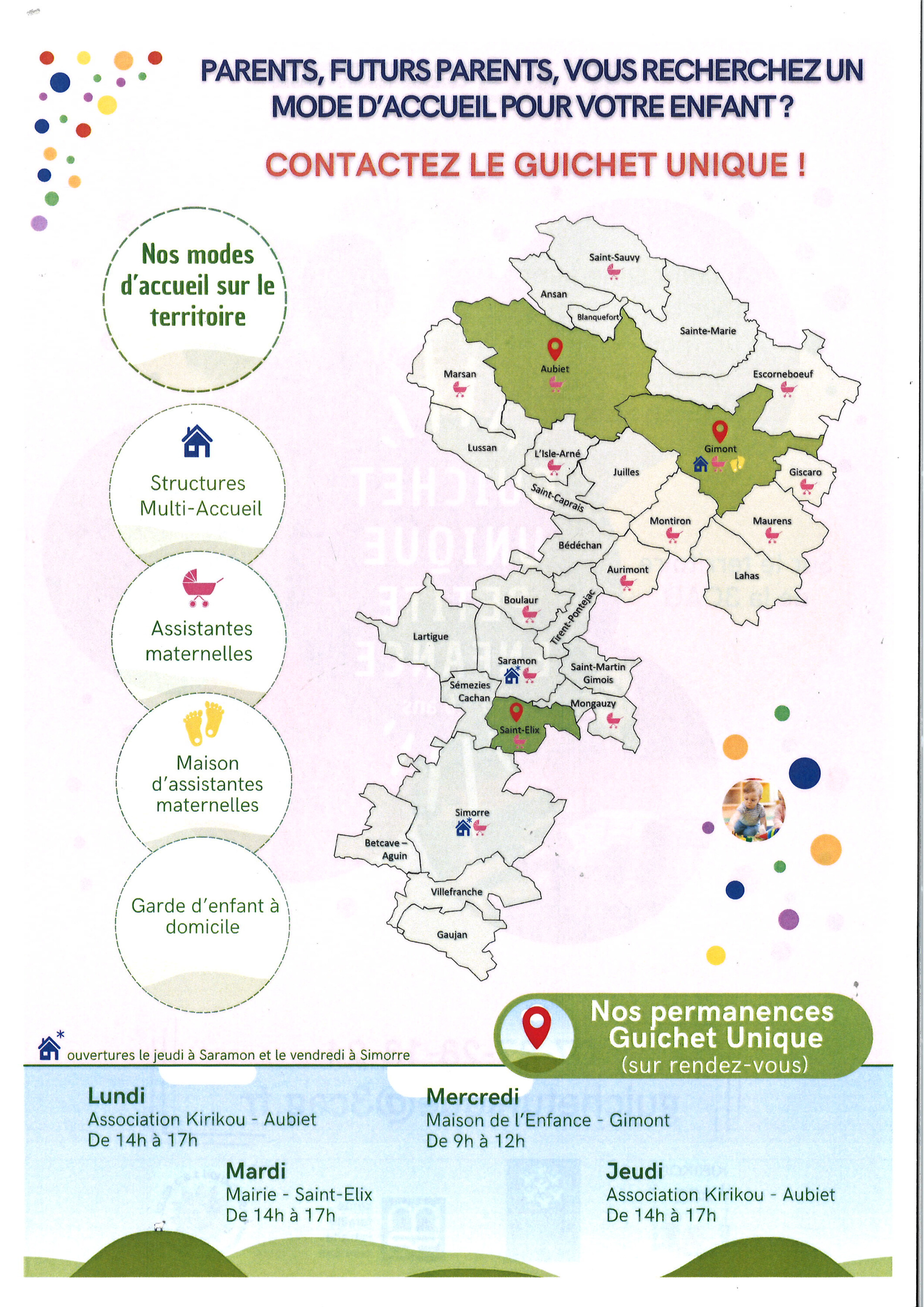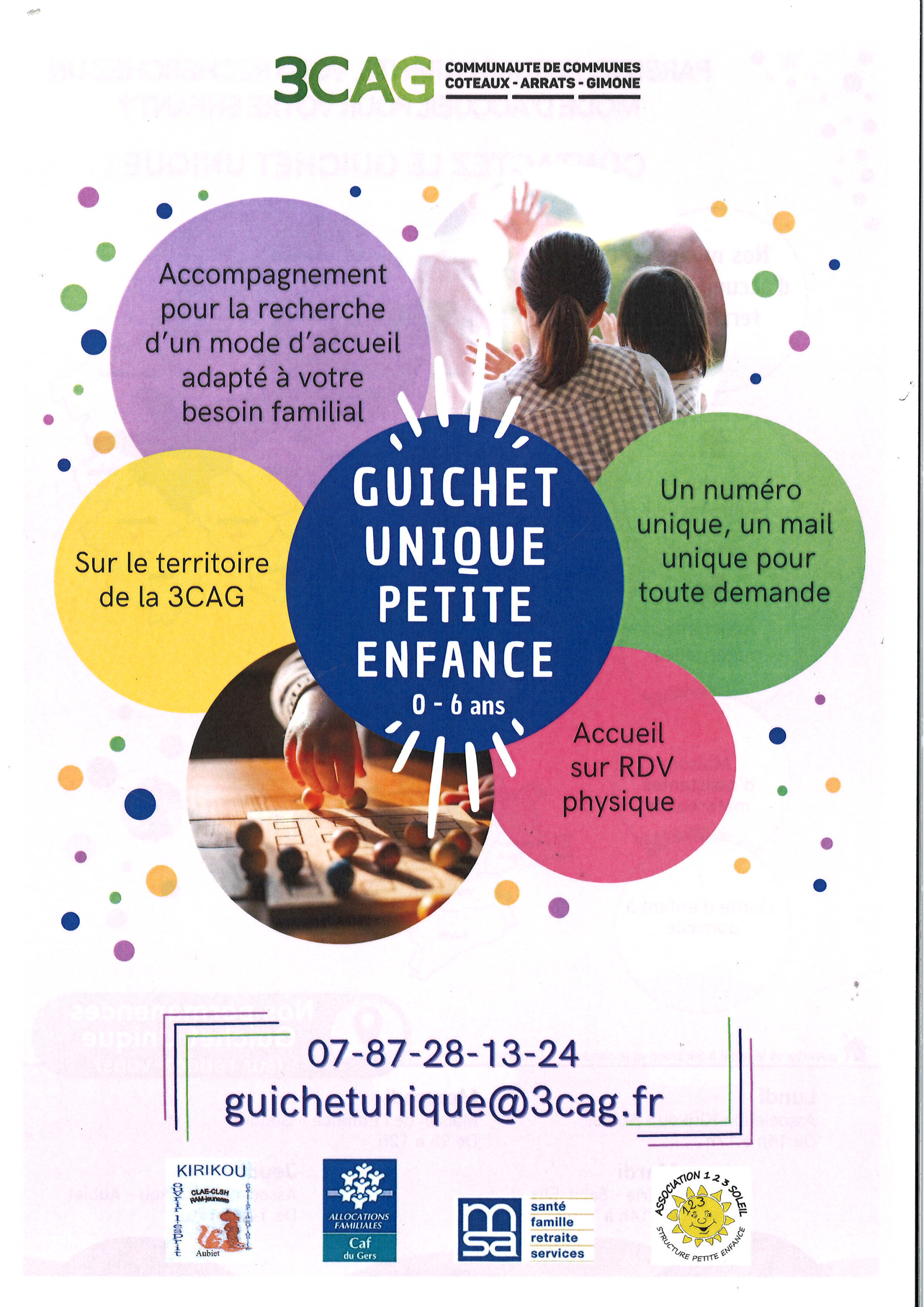 Dans le cadre du déploiement du Guichet Unique Petite Enfance sur le territoire de la 3CAG, nous vous informons de la nouvelle organisation pour la réception des demandes des familles à la recherche d’un mode d’accueil, collectif et/ou individuel.