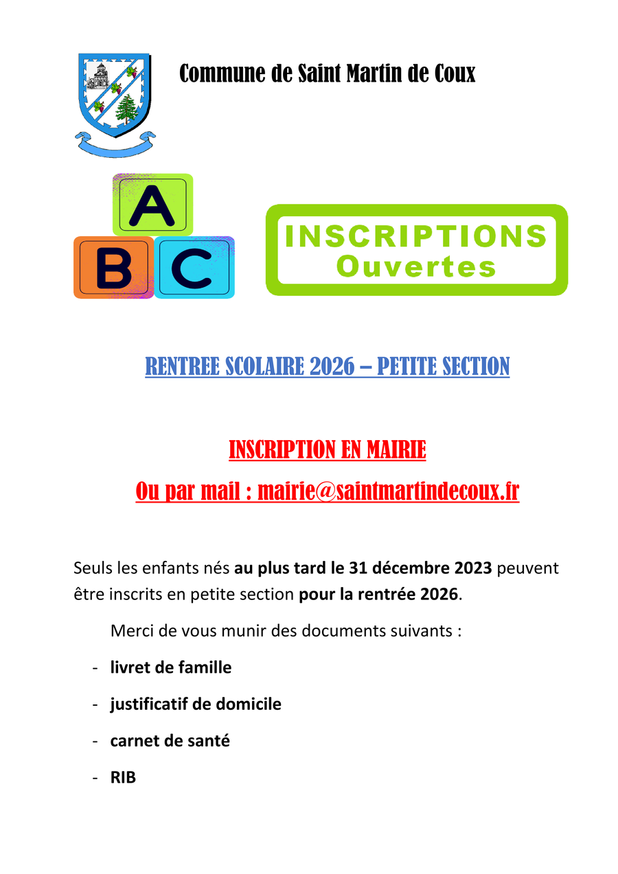 Notre commune faisant parti d’un Regroupement Pédagogique Intercommunal (RPI), votre enfant intègrera l’école maternelle de Saint-Martin-de-Coux.