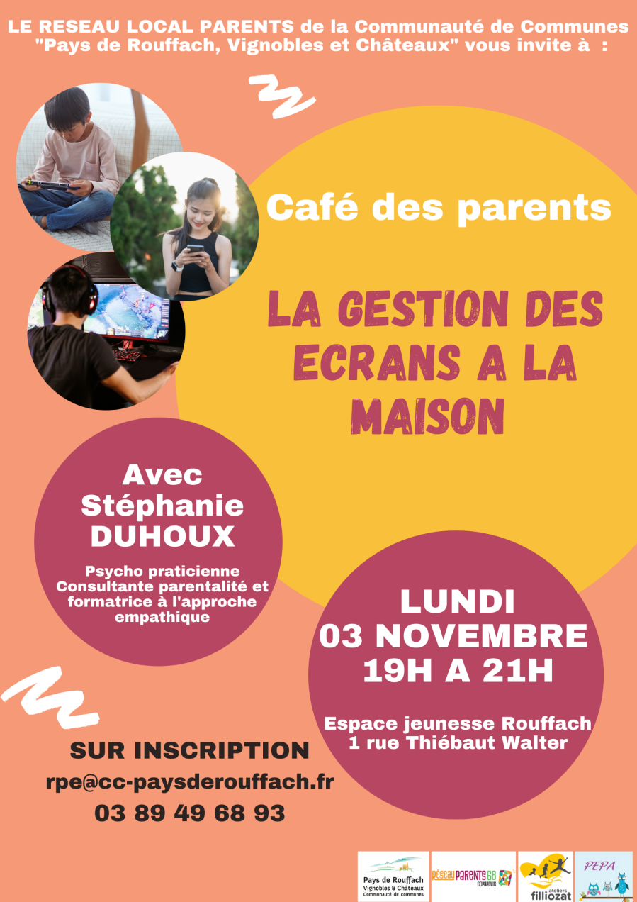 Café des parents sur le thème des écrans ou comment gérer et limiter leur utilisation à la maison avec vos enfants de tout âge (0-18 ans). Stéphanie Duhoux vous apportera des outils concrets afin d'encadrer plus facilement leur utilisation en fonction de l'âge de vos enfants pour leur éviter une fatigue excessive, irritabilité ou nervosité.