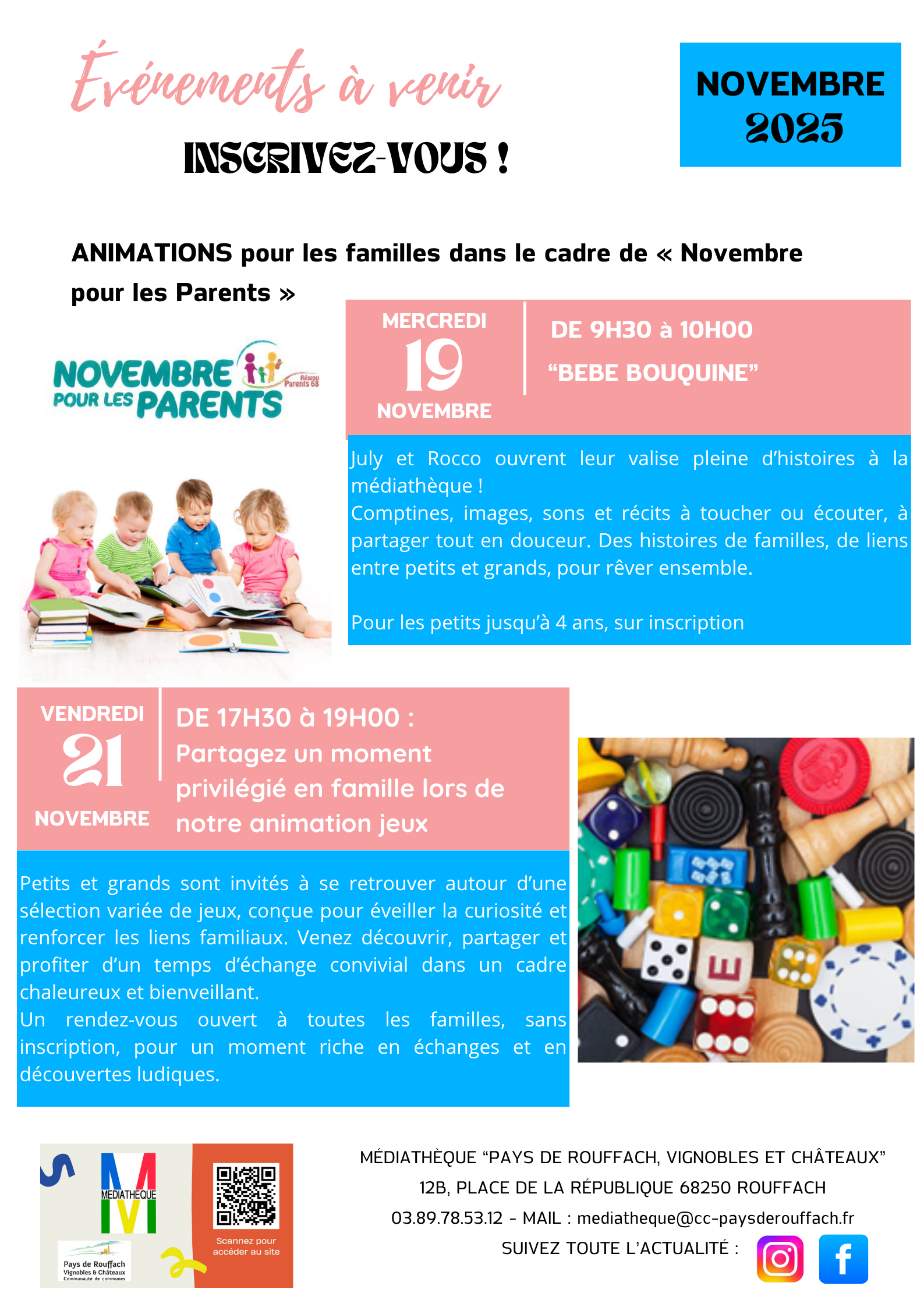 Deux temps d'animations avec bébé autour du livre et un temps de jeux pour petits et grands à la Médiathèque.