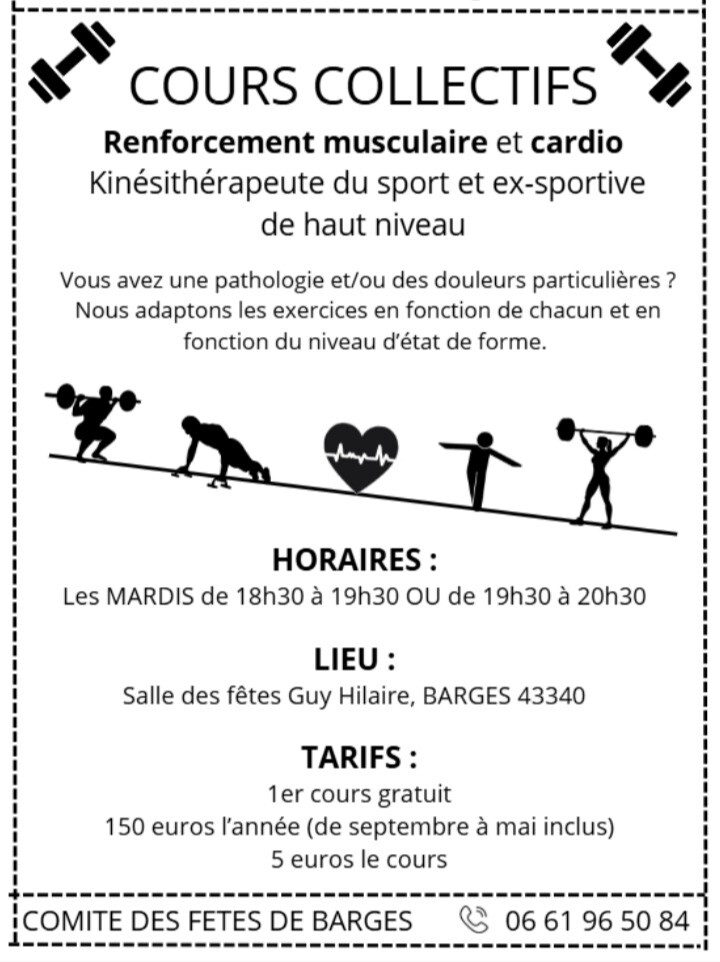 Le comité des fêtes de BARGES, avec le soutien de la municipalité, vous propose des cours collectifs de renforcement musculaire et cardio.