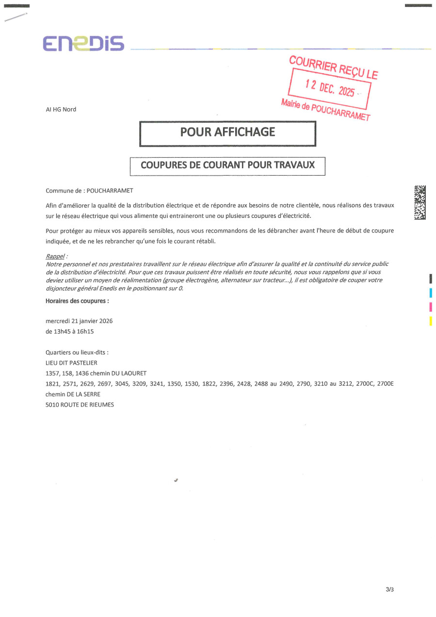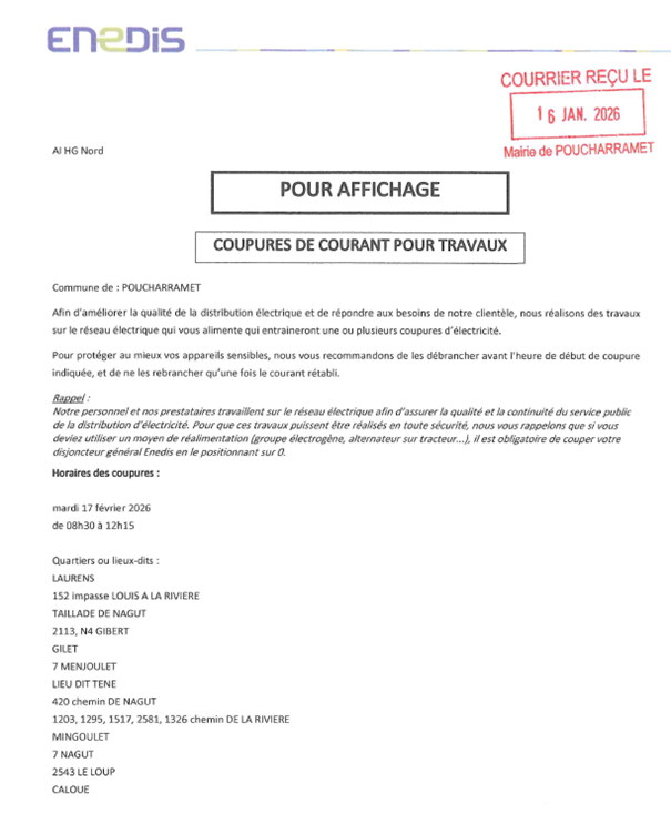 ENEDIS nous informe que le mardi 17 février 2026 de 8h30 à 12h15, des coupures de courant pour travaux auront lieu.