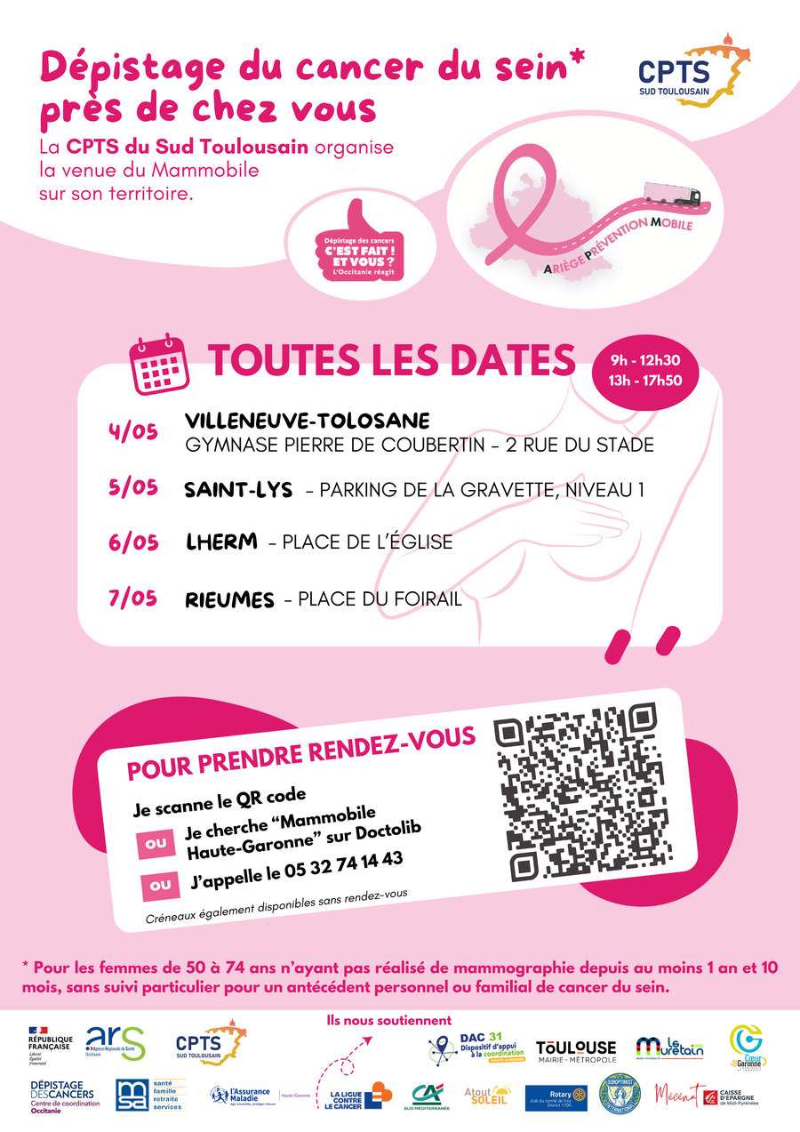 Dans le cadre de la prévention du cancer du sein, la CPTS du Sud Toulousain accueille le Mammobile Ariège sur son territoire du 4 au 7 mai 2026.