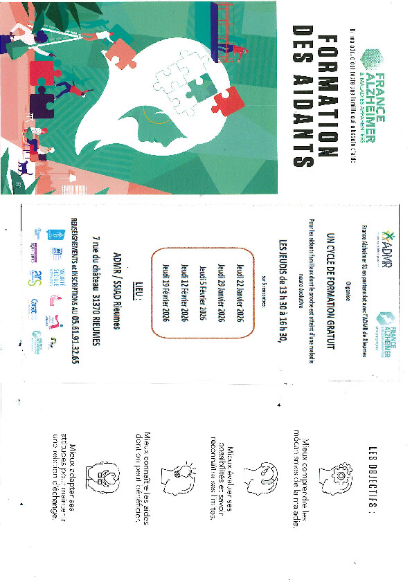 Nous avons le plaisir de vous informer que l’association ADMR de Rieumes, organise, en partenariat avec l’association France Alzheimer, une formation d’aide aux aidants qui débutera le 22/01/2026.
