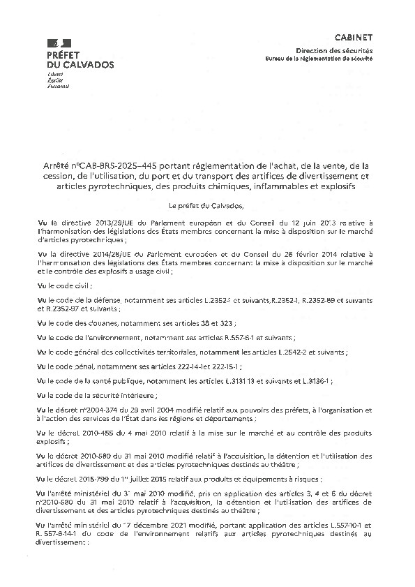 Ci-dessous un arrêté préfectoral portant sur la réglementation de l'achat, de la vente, de la cession, de l'utilisation, du port et du transport des artifices de divertissement et articles pyrotechniques, des produits chimiques, inflammables et explosifs du jeudi 30 octobre 2025 à 12h00 au lundi 03 novembre 2025 à 08h00.