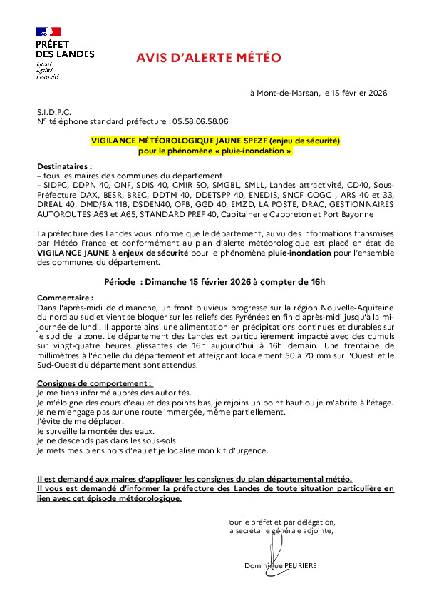 La prĂ©fecture des Landes vous informe que le dĂ©partement, au vu des informations transmises par MĂ©tĂ©o France et conformĂ©ment au plan dâalerte mĂ©tĂ©orologique est placĂ© en Ă©tat de VIGILANCE JAUNE Ă enjeux de sĂ©curitĂ© pour le phĂ©nomĂšne pluie-inondation pour lâensemble des communes du dĂ©partement.
